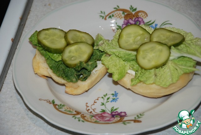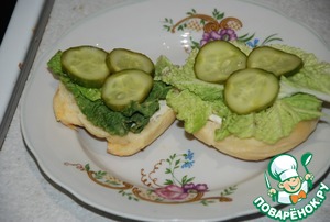 На булочку с сырным соусом, выкладываем салат, на него огурчики.