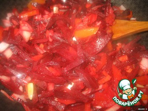 • А сами готовим зажарку: шинкуем свеклу, морковь, лук, помидор, перец и добавляем чеснок с грибами - всё обжариваем на растительном масле...