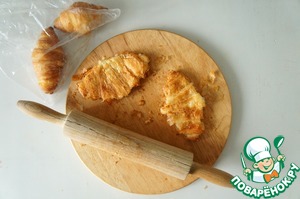 Я, когда в кафе работала, у нас такое в меню было... не проданные за день круассаны превращаюсь в прекрасные сендвичи, только из скалкой не раскалывали, а готовое изделие отправлялось в духовку минут на 5 при 200 гр