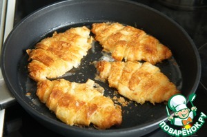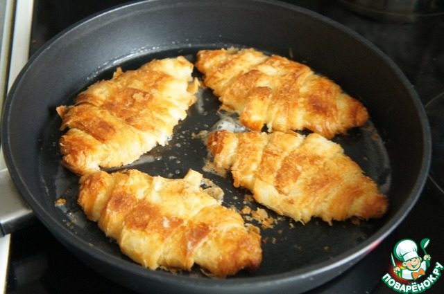 На хорошо разогретой сковороде быстро обжарить круассаны до румяной корочки с двух сторон на сливочном масле.