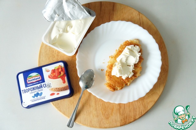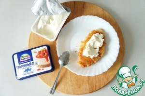 Горячие круассаны смазать творожным сыром.