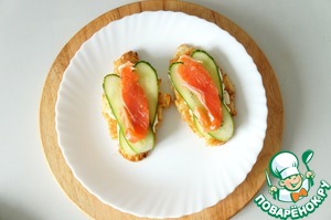 Положить ломтики огурца, рыбу.