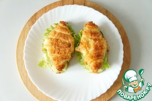 Сверху лист салата и накрыть вторым круассаном.