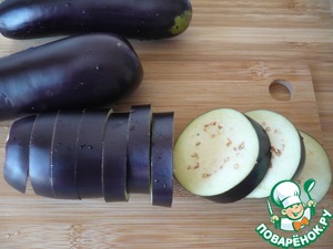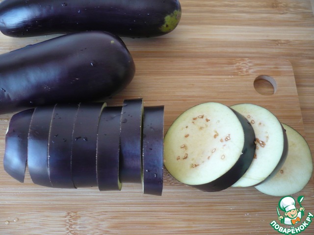 Тщательно помойте баклажаны, отрезав плодоножку, нарежьте баклажаны кружочками. Посыпьте ломтики баклажанов солью и оставьте на 15 минут.