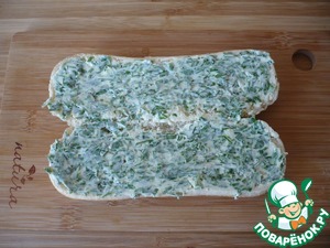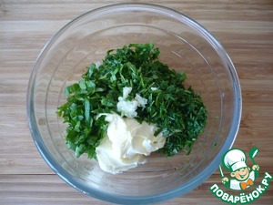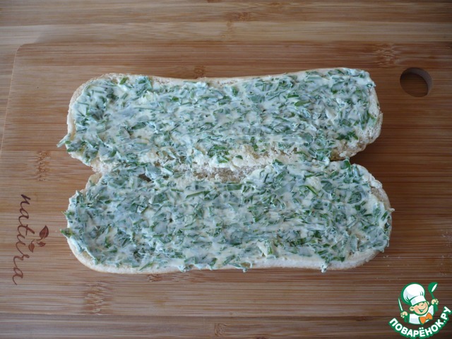 Для приготовления намазки: разомните размягченное сливочное масло с нарезанными петрушкой, шнит-луком и измельченным зубком чеснока.