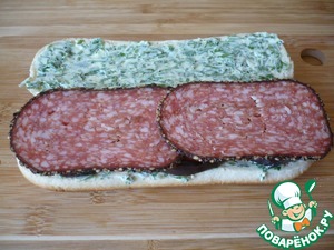 На ломтики баклажан положите колбасу сервелат с перцем.