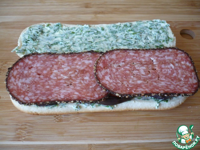 Накройте сэндвич второй половинкой булочки.