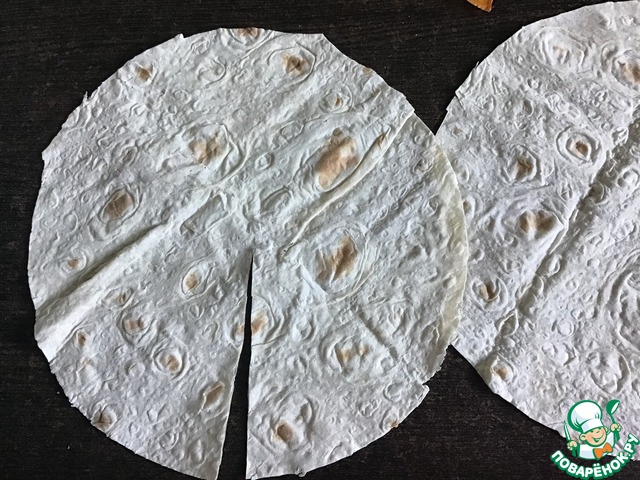 Нам понадобится тонкий круглый лаваш, либо армянский. Из тонкого армянского лаваша вырезаем два круга по диаметру сковороды, в которой будет обжариваться закуска. Если лаваш очень тонкий, а начинка сочная, то вырезаем ещё пару кругов. А крышка от сковороды - вам в помощь.