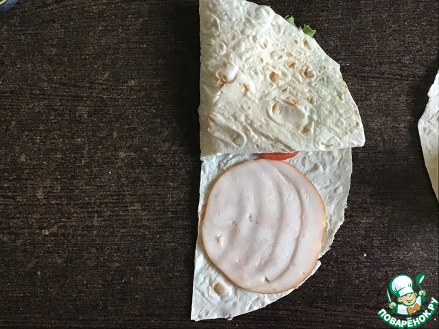 Визуально делим круг лаваша на 4 сектора и помещаем в каждый сектор определенный продукт, начиная от разреза, по часовой стрелке: листья салата, сыр плавленый (1-2 ломтика), кружки помидора и ломтик ветчины.