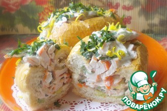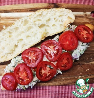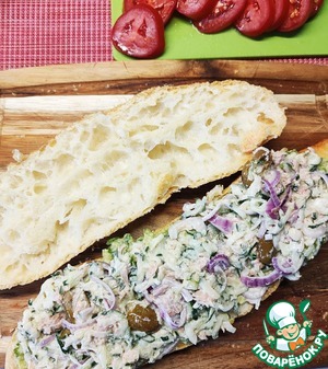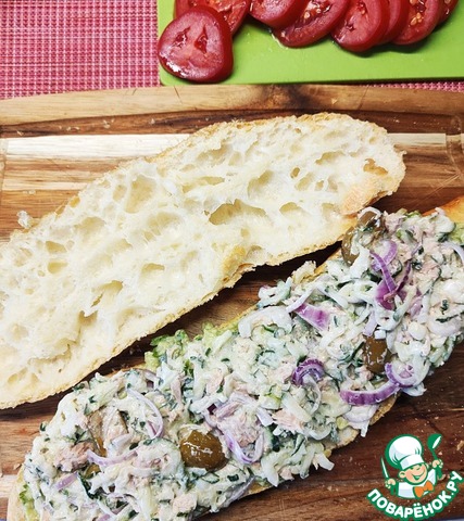 Большой сэндвич из багета с огуречно-тунцовой начинкой. Рецепт нашла у итальянцев. Они любят такие большие, многослойные закуски. А нам нравится все, что вкусно. А этот сэндвич конечно вкусный!