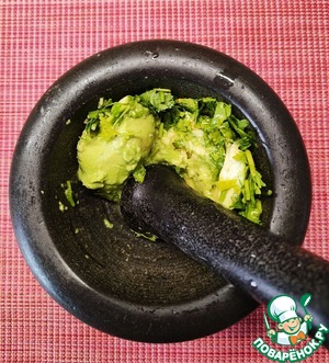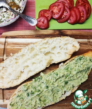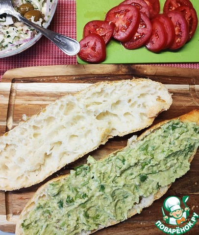 Начинаем собирать сэндвич. Для начала разрежем багет вдоль, слегка подсушим разрезы на сковороде. Это необходимо для того, чтоб хлеб не размокал. Нижнюю половинку смажем соусом из авокадо.
