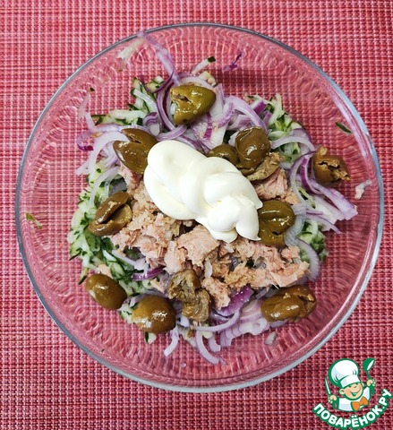 Смешать отжатые огурцы, тунец, отцеженный лук, оливки и майонез. Посолить. Добавить мелкопорезанную петрушку.