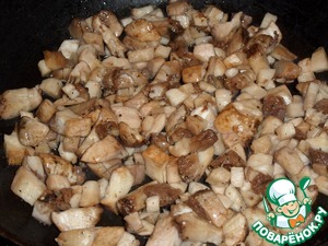 Сковороду ставим на огонь. Смазываем ее растительным маслом и выкладываем нарезанные грибы.