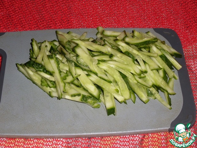Затем поверх грибов и сыра выкладываем нарезанные огурцы. Добавляем поверх огурцов 1,5 ч. л. творожного сыра с зеленью.