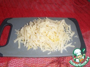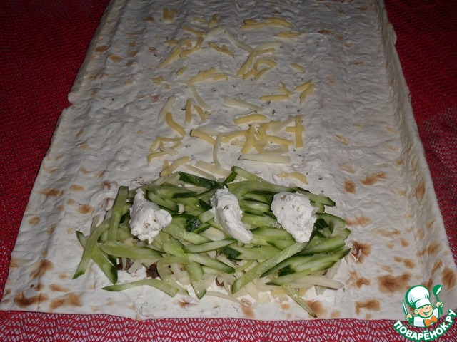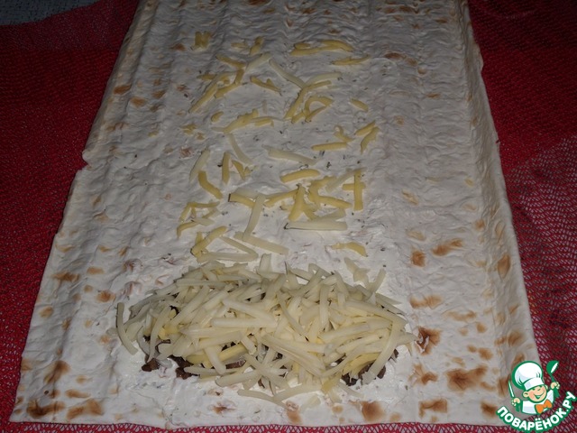 Поверх грибов добавляем натертый полутвердый сыр. Также немного натертого сыра распределяем по поверхности лаваша.