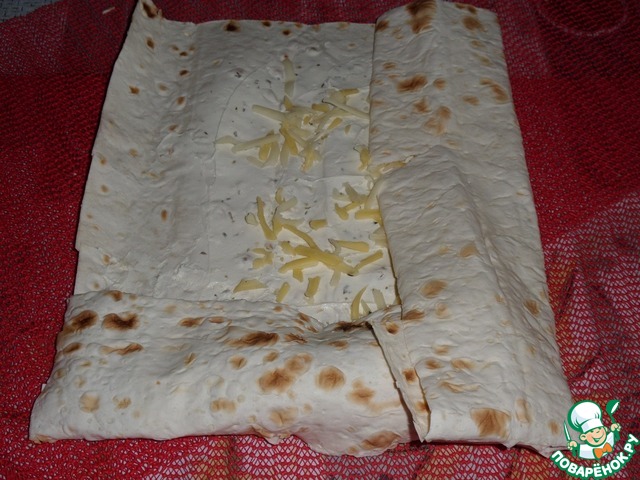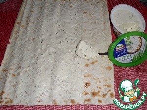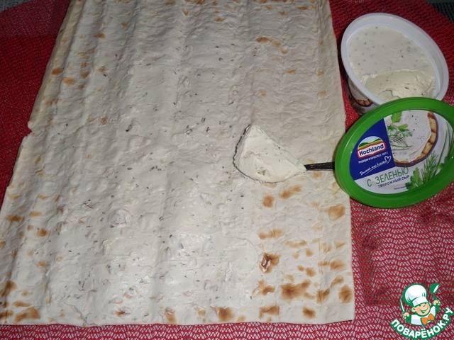 На лаваш выкладываем 1 ч. л. с горкой творожного сыра с зеленью ТМ "Hochland " и равномерно распределяем его в центральной части лаваша.