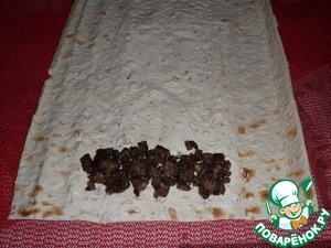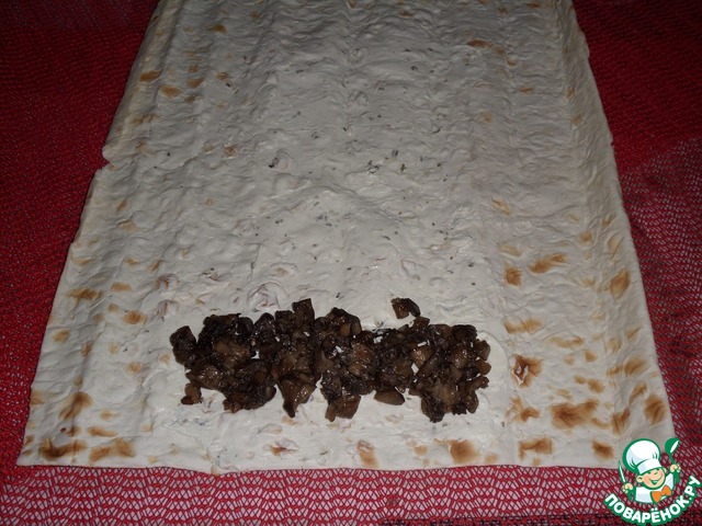 Затем на край лаваша выкладываем половину обжаренных грибов.