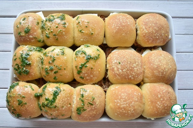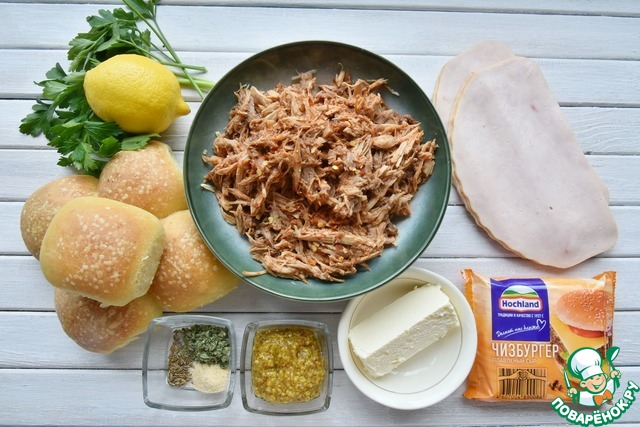Сверху на булочки раскладываю кусочки ветчины и рваную свинину.