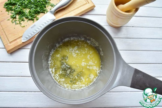 Для соуса мохо, в сотейнике растапливаю сливочное масло и добавляю перетертые в ступке специи: зиру, регано, сухой чеснок.