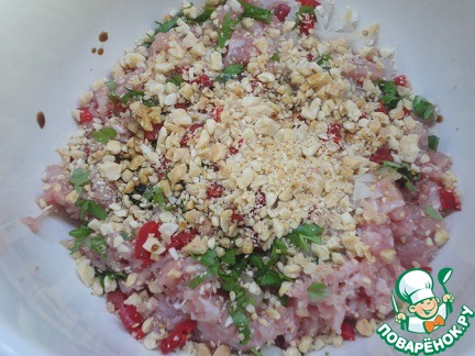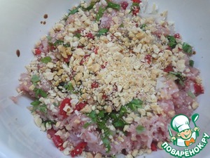 Приготовьте фарш из филе курицы (любой любимой вами части) и смешайте с рубленым арахисом, зеленью кинзы, соевым соусом и измельченным острым перцем. Перемешайте. Я не солила, мне хватило соли жареного арахиса и соевого соуса.