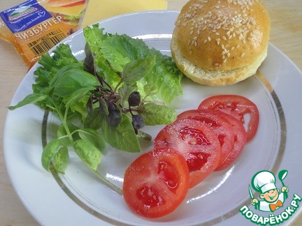 На нижнюю часть булочки выкладываем лимтья салата, на них пластинку плавленного сыра "Чизбургер", затем кружочек помидора, сверху котлету, на нее еще кружочек помидора и листья базилика. Накрываем верхней частью булочки. Подаем с томатным соусом чили.