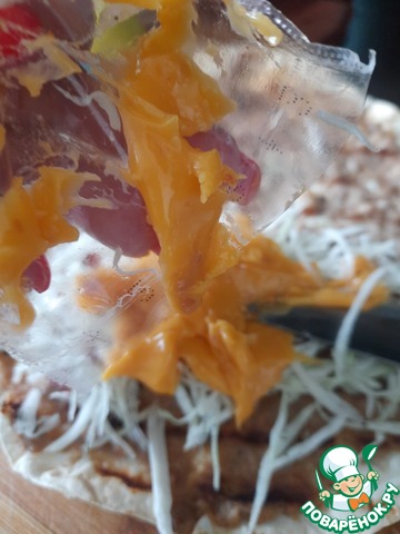 Выложить на половинку лепешки бекон, капусту, помидор и маринованный лук.