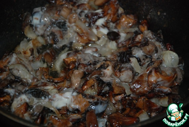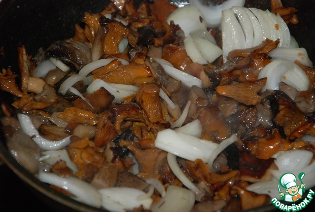 • Нарезанные грибы выложить на раскаленную сковородку, смазанную растительным маслом. На довольно приличном огне, изредка помешивая, испарить всю жидкость. Добавить половину луковицы, нарезанной полукольцами. Когда лук и грибы хорошо обжарятся, посолить.