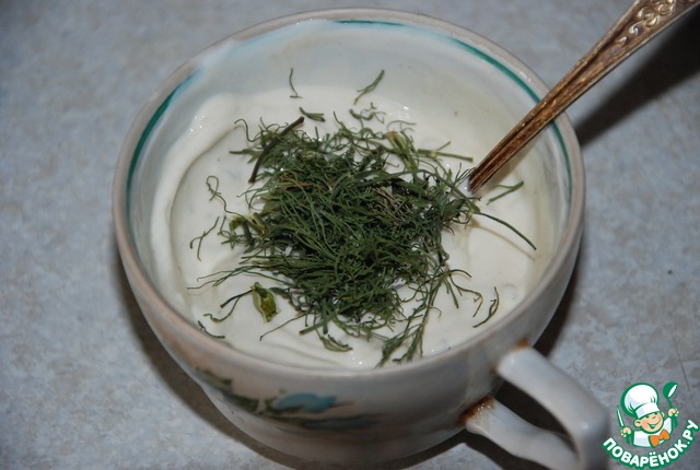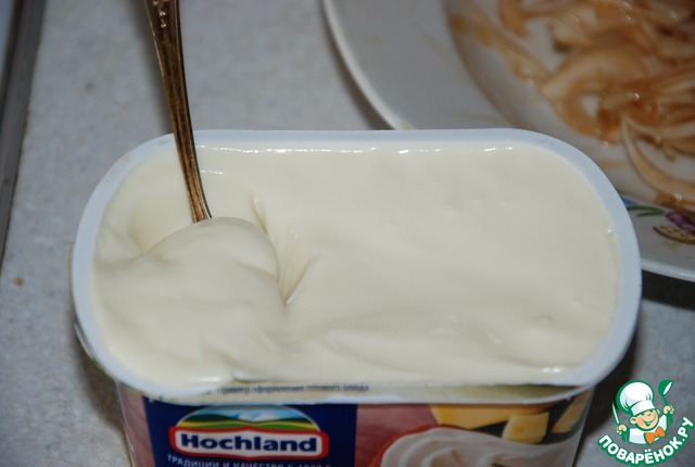 • Готовим заправку. Смешиваем сметану, творожный сыр и горчицу. Можно добавить немного зелени, что я и сделала.