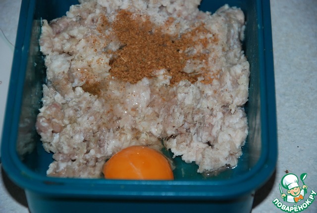 • В мясной фарш добавить желток, соль и перец. Все хорошо вымесить.