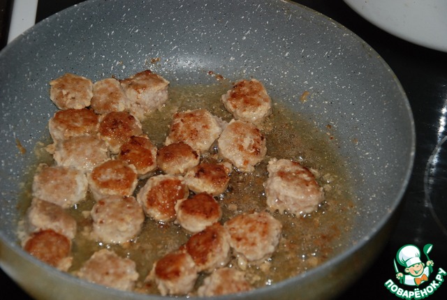 • Сформировать очень небольшие мясные шарики и обжарить их на сковороде, смазанной растительным маслом.