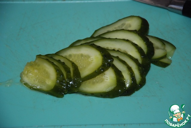 • Нарезать тонкими слайсами наискосок маринованные огурцы.