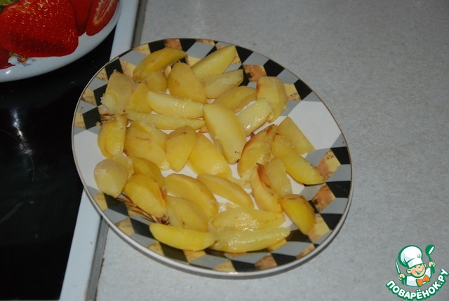 • Очищенный картофель нарезать крупными дольками, положить в форму для духовки, смазанную растительным маслом и отправить в духовку, разогретую на 180 гр, на 1 час