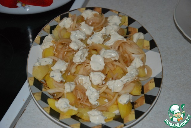 • Выкладываем поверх картофеля маринованный лук и всю заправку. Небольшое количество заправки должно попасть на каждую картофелину.