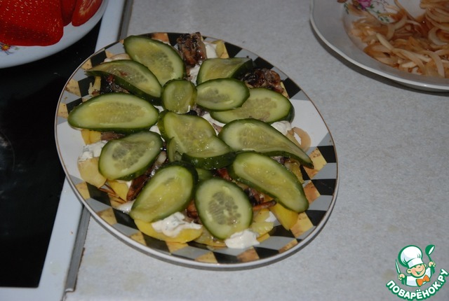 • Выкладываем жареные грибы и нарезанные слайсы огурца.