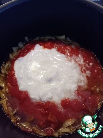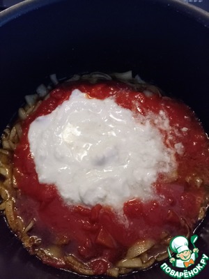 В казане на плите томить лук до мягкости и прозрачности. Добавить куркуму, карри, имбирь, перец чили. Перемешать. Влить банку кокосового молока и пассерованные томаты.
