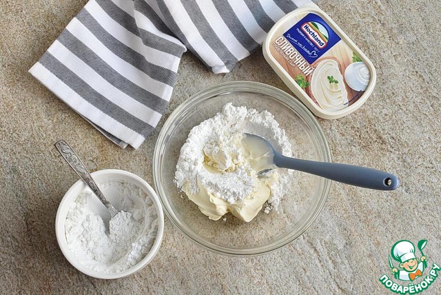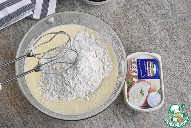 7. Пока кекс печется, приготовьте глазурь. Постепенно добавляйте в сливочный сыр Хохланд просеянную сахарную пудру, тщательно перемешивая ложкой. Количество пудры можете варьировать по вкусу, смотря какую густоту глазури вы предпочитаете.
