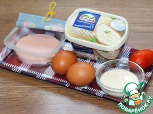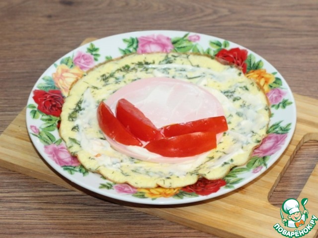 8. И выложите на омлеты ломтики колбасы. Смажьте колбасу плавленным сыром.