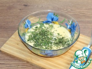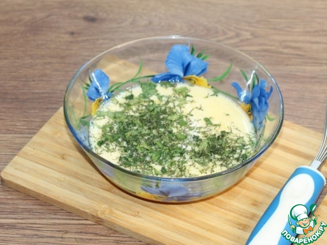 4. Добавьте молоко 4 ст. л. и 1 ст. л. измельченной зелени, перемешайте.