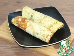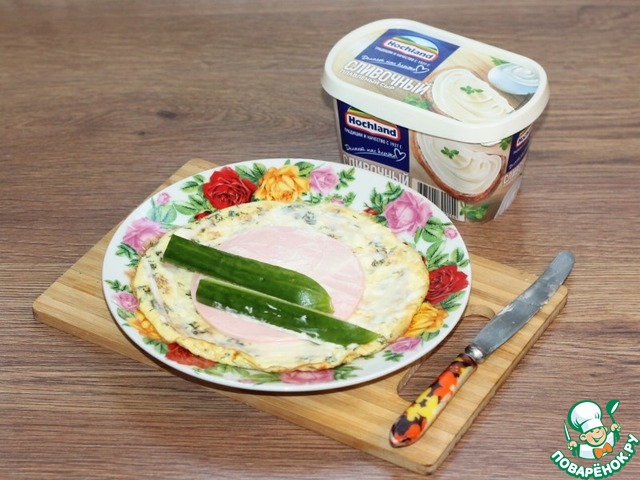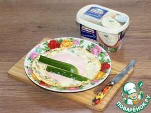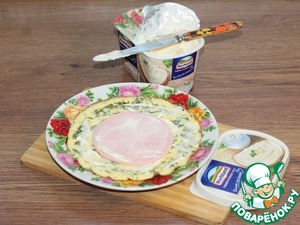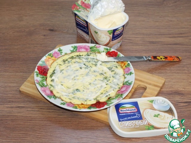 7. Тонким слоем смажьте омлеты плавленным сыром.