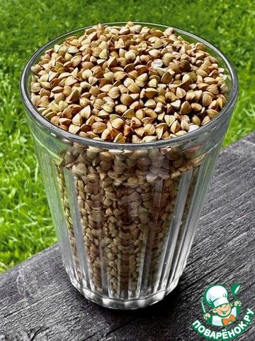 Просто гречка. 1 стакан. Ну ладно, не «просто» гречка, а как написано было на пакете «Зеленая гречка». Что уж производитель имел в виду – не знаю, но как выглядит гречка, так сказать, нового урожая и только-только прошедшая все стадии от поля до товарной крупы, я знаю. Поэтому «зеленая» в данном случае, как мне кажется, это гречка нынешнего урожая. Наисвежайшая, так сказать.