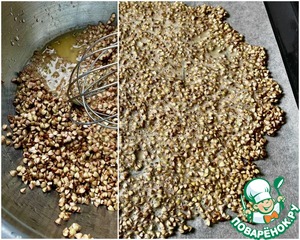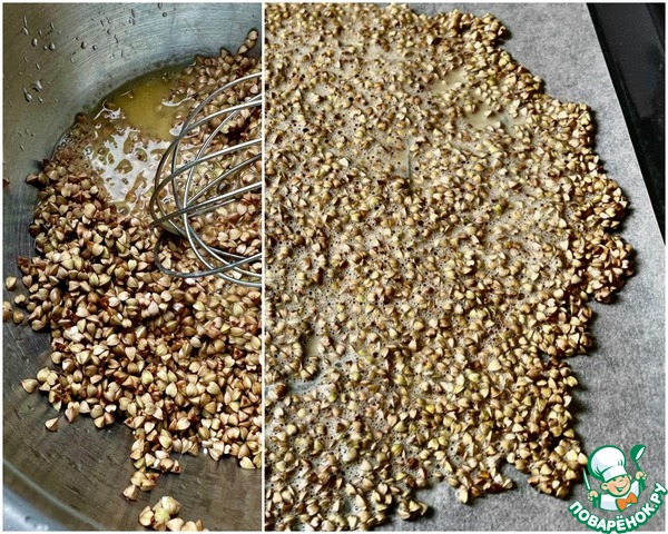 Хорошо перемешал. Тщательно. А потом выложил на лист бумаги для выпечки, расстеленной по противню. Выровнял слой гречки прямо вот «в одну крупинку) толщиной. По крайней мере постарался так выровнять.