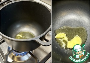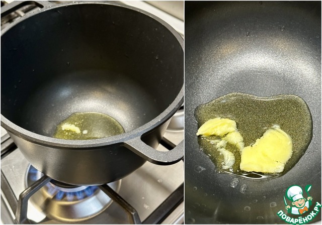 Ложку столовую «с верхом» топлёного масла в котелок, растопил его, прогрел хорошо и некрупно порубленную луковицу в масло отправил.