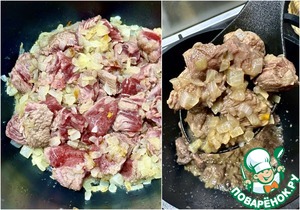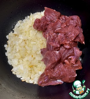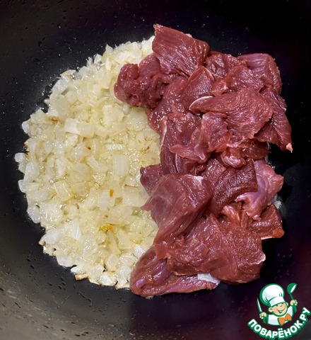 Постоянно помешивая, довел лук до предпрозрачности. И выложил к нему мясо. Мякоть говядины у меня была. От голяшки. Без малого 400 граммов.