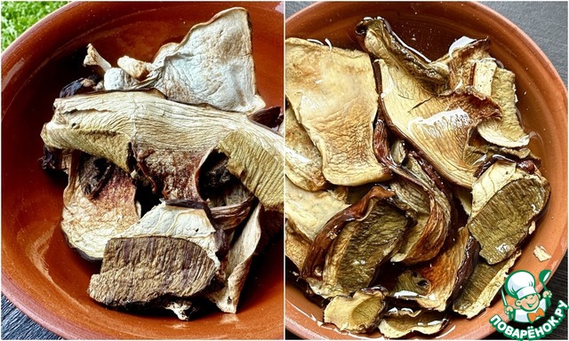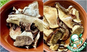 Грибы. Ну воля ваша, а я взял боровики сушеные. Есть пока запасец. Обязательно надо замочить грибы в тёплой воде. Хотя бы на час-другой. И потом тщательно промыть. Дабы исключить всякие там песчинки. А вот воду от грибов не вылил. Но очень хорошо процедил. Я марлю в четыре слоя сложил, и …, не оказалось у меня бумажного фильтра в запасе.