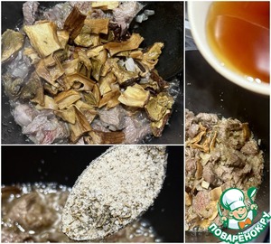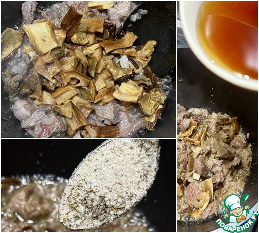 Как только мясо с луком будут готовы, добавил туда грибы и вылил воду. Ту, что от грибов.