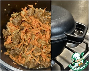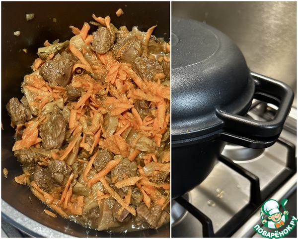 И не забывая, опять-таки, постоянно перемешивать, мясо …, в общем, я обычно довожу до появления вот такой розовой, ну не то, чтобы корочки, а наверное, что-то типа мягкой такой «глазури»?