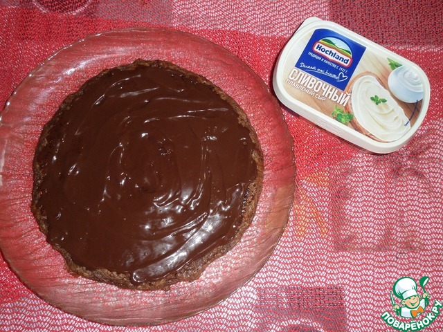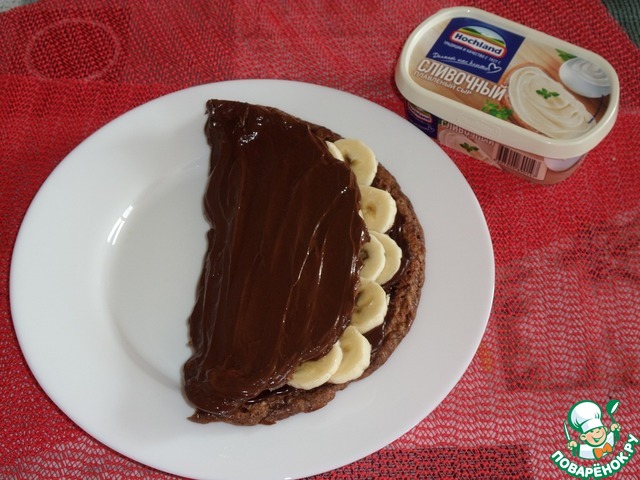 Собираем наш десерт. На блин выкладываем большую часть шоколадно-сырной массы и равномерно распределяем по поверхности блина.