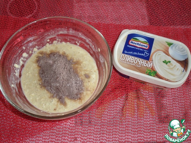 В миску добавляем яйцо и плавленый сливочный сыр. Хорошо перемешиваем.