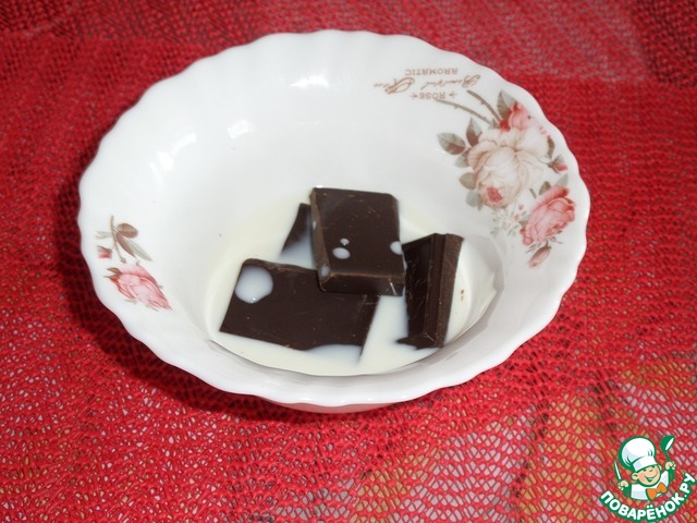 В миску выкладываем шоколад (я взяла горький 70%). Молоко подогреваем в микроволновой печи и заливаем шоколад. Хорошо перемешиваем.