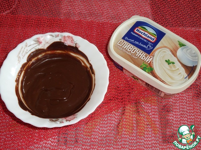 Накрываем начинку краем блина. Поверх выкладываем оставшуюся часть шоколадно-сырной массы и равномерно распределяем.